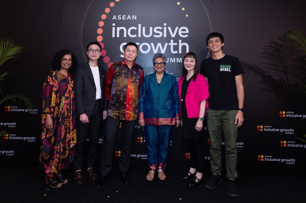 L-R: Subhashini Chandran, Senior Vice President, Social Impact, APEMEA, Mastercard Center for Inclusive Growth; Sean Lew, Head of Growth, N&E Innovations; Shaun Seow, CEO, Philanthropy Asia Alliance; Shamina Singh, Founder and President, Mastercard Center for Inclusive Growth; Karen Cheah, Founder and CEO, Alterpacks; Max Mandias, Co-Founder and COO, Green Rebel.