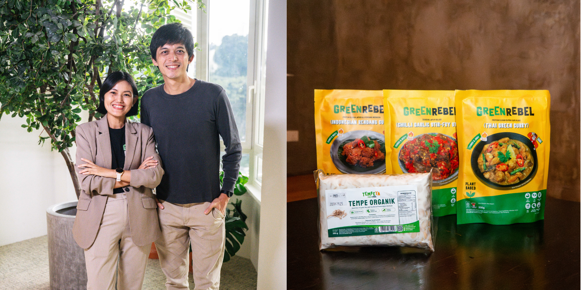 Helga Tjahjadi, Co-Founder and CEO, and Max Mandias, Co-Founder and COO; Green Rebel’s Indonesian Rendang Curry, Chilli Garlic Stir-Fry Strips, and Thai Green Curry.